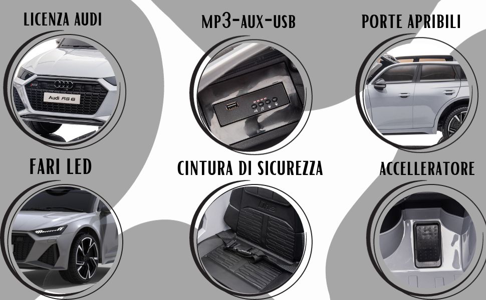 Il prodotto è ufficialmente prodotto con autorizzazione ufficiale del marchio AUDI.Tra le principali caratteristiche di questo fantastico modello, troviamo certamente un'elevata potenza che raggiunge i 12 Volt con una trazione a 2 motori, marcia avanti ed indietro, piccolo display digitale sul cruscotto, fino ad un massimo di 5 km/h, suoni e luci a LED reali, Sedile ergonomico per assicurare il divertimento dei bambini dotato di cinture di sicurezza. Ammortizzatori, porte apribili e un ingresso USB e cavo AUX per collegare qualsiasi riproduttore musicale e far vivere così ai vostri piccoli un'esperienza di guida vicinissima alla realtà guidando una auto in miniatura con i vantaggi e tutti i comfort di una vera e propria automobile per i vostri bambini che potranno sentirsi dei grandi piloti! Inoltre, il radiocomando parentale a infrarossi incluso, vi permetterà di prendere i comandi dell'auto a distanza se il vostro bambino è troppo piccolo per farlo, o semplicemente per la vostra sicurezza.