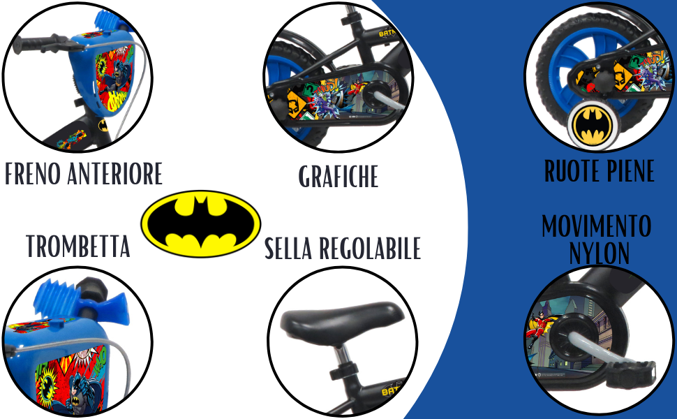 Questa bicicletta con licenza Batman è dotata di freni anteriori e ha una ruota posteriore fissa; così quando la pedalata si ferma, la bici si arresta, ruote in nylon da 12 pollici e pneumatici EVA antiforatura e viene fornito con stabilizzatori rimovibili.