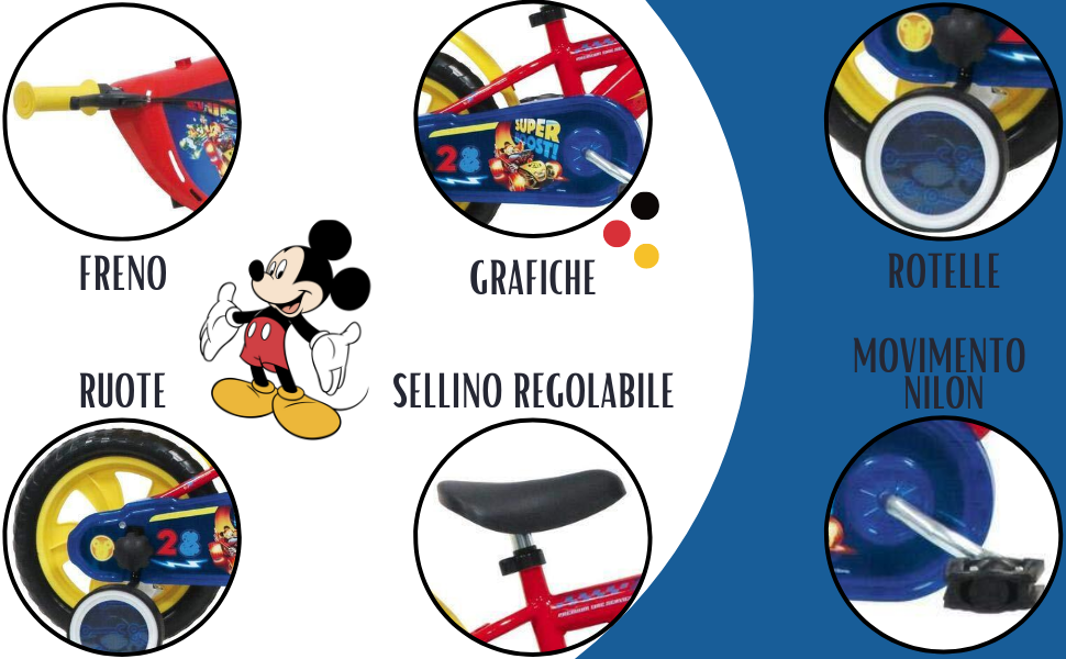 Il telaio della nostra bicicletta per bambini presenta uno splendido design ispirato a Mickey Racers e realizzato in acciaio quindi molto resistente; la misura è di 12''.Questa bici ha un movimento centrale e serie sterzo in nylon, inoltre ha un pignone fisso con un freno anteriore modello caliper ruote , le coperture in dotazione alla bicicletta sono fatte con materiale eva, molto resistenti. La bicicletta è dotata di un pratico cestino, ideale per metterci all'interno giochi e pupazzi , l'ideale da regalare ai vostri bambini per ogni occasione: natale, compleanno o qualunque cerimonia o festa con questo pacchetto farete sempre un' ottima figura.