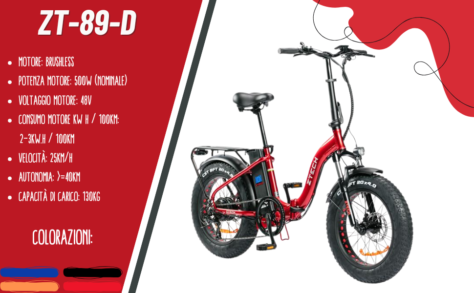Scopri ZT-89D: la tua soluzione ideale per spostamenti urbani veloci e sostenibili. Con una velocità massima di 25km/h e un’autonomia fino a 40km *, questo modello garantisce prestazioni affidabili. Il tempo di ricarica varia tra le 4 e 6 ore. Equipaggiato con display LCD Display SW900 , telaio pieghevole, pedalini ripiegabili e portapacchi posteriore, il ZT-89D combina funzionalità ed eleganza in un design compatto.