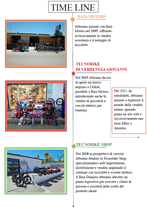 Nel corso degli anni, è sorta l'esigenza di aprire uno shop online, che ci ha permesso di raggiungere una clientela ancora più vasta e di offrire i nostri prodotti a un pubblico più ampio. Abbiamo ampliato la nostra offerta, integrando nuovi prodotti come E-bike, Scooter Elettrici, Monopattini e Veicoli Elettrici per Bambini.