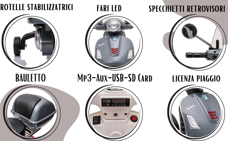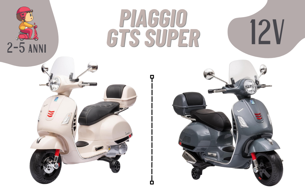 Vespa per Bambini una fedele riproduzione del mitico scooter dell'azienda Italiana Piaggio. Questo scooter elettrico per bambini darà la possibilità ai vostri bambini di vivere le emozioni che regala la guida dei modelli Piaggio, leader nel settore degli scooter dal 1946. Un marchio che grazie alle sue idee ha scritto la storia del Made in Italy. La Vespa Rosa da sempre un must per chi vuole avere un mezzo di trasporto comodo e agile per la città sarà una vera gioia per i vostri bambini sentirsi dei veri piloti su questo pezzo di storia italiana. Regala giornate indimenticabili ai tuoi piccoli con la Vespa GTS Sport saranno molto felici.