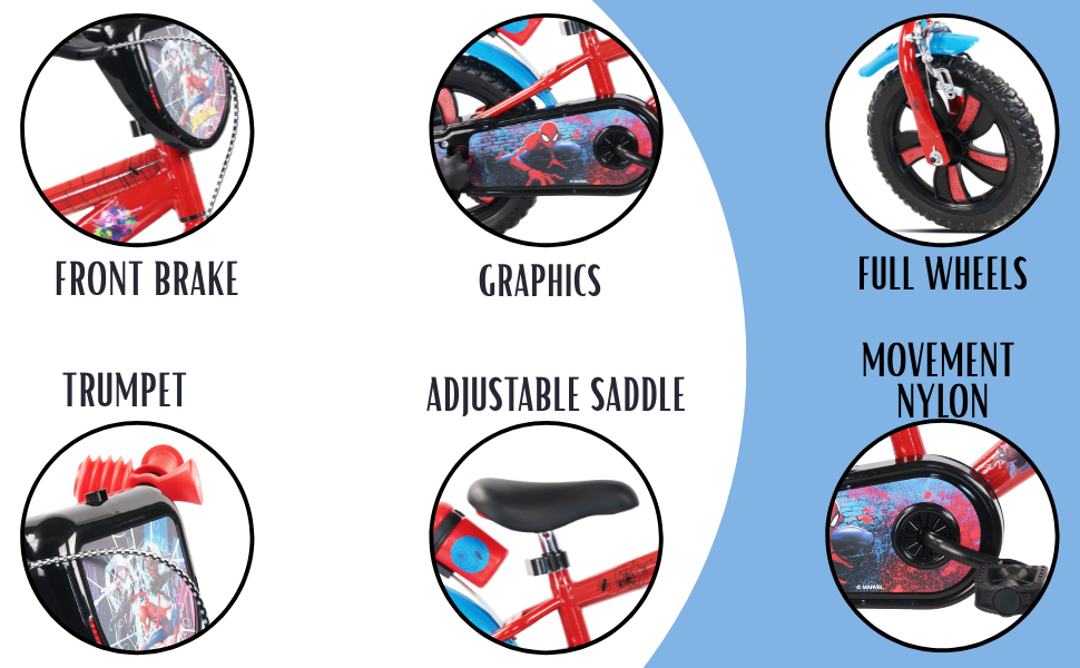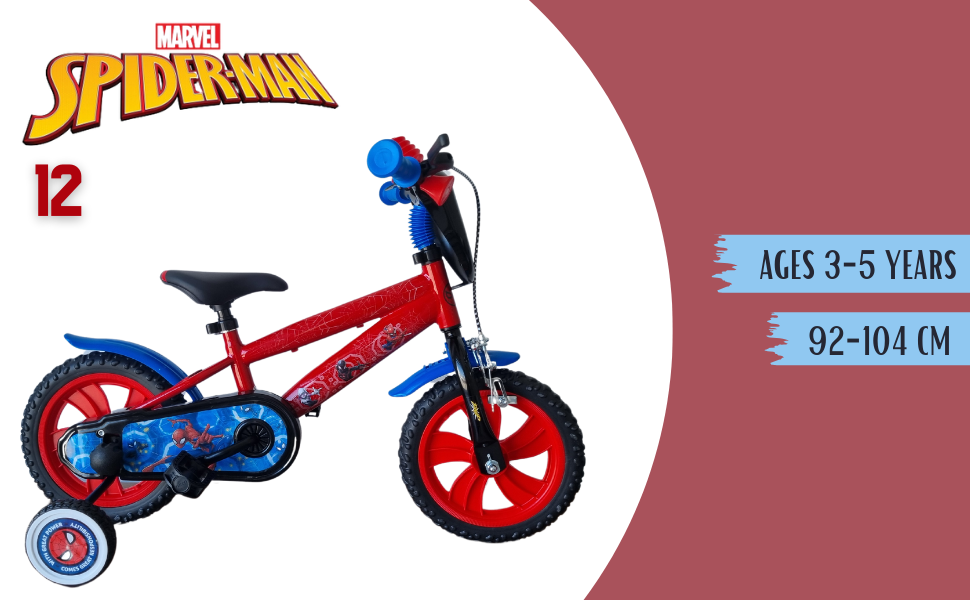 La bicicletta Spider-Man 12" è ideale per bambini dai 3 ai 5 anni. Robusta e sicura, è dotata di ruote in nylon con pneumatici EVA antiforatura, freno anteriore e ruota posteriore fissa per maggiore controllo e sicurezza. Sella e manubrio regolabili crescono insieme al bambino, rendendo la bici pratica e duratura.