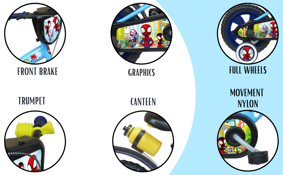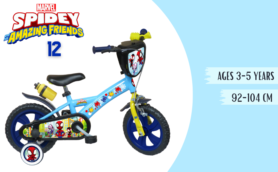 Vélo Spidey pour enfant – taille 12'' – avec petites roues et frein avant – couleur bleu/jaune. Le cadre en acier présente un design inspiré de Marvel Spidey et ses amis. Le vélo est équipé d’un pignon fixe, d’un frein avant à étrier (caliper), de roues en EVA ainsi que d’un boîtier de pédalier et d’un jeu de direction en nylon. Doté d’un panier pratique, il est idéal comme cadeau de Noël, d’anniversaire ou pour toute autre occasion spéciale.