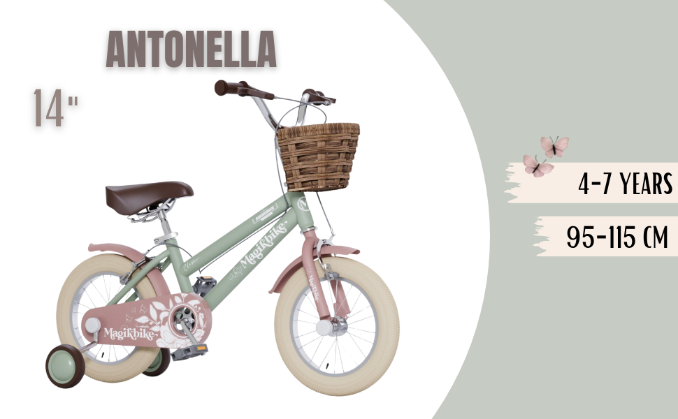 Le vélo Antonella est disponible avec des roues de 12", 14", 16" et 20", afin de s’adapter parfaitement à la taille et à l’âge de l’enfant.