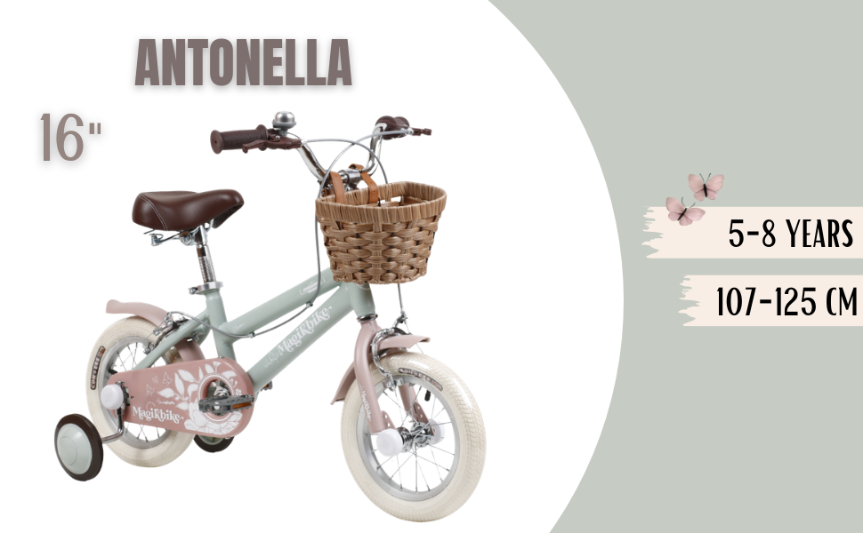 Le vélo Antonella est disponible avec des roues de 12", 14", 16" et 20", afin de s’adapter parfaitement à la taille et à l’âge de l’enfant.