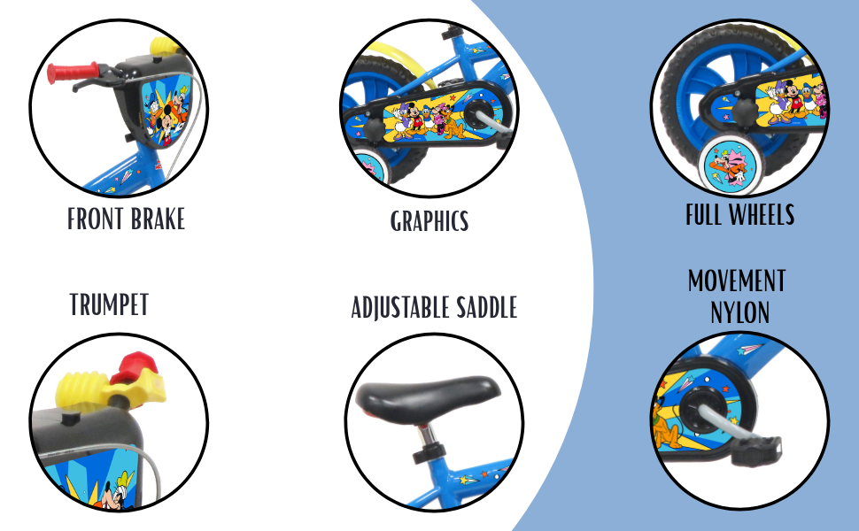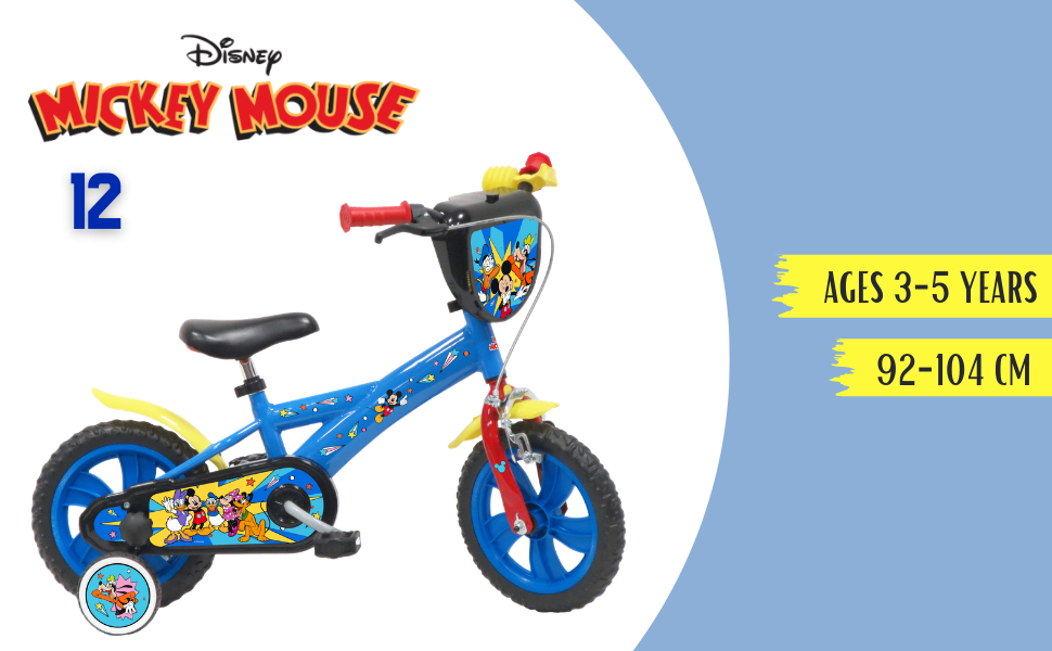 Vélo Mickey pour enfant – taille 12'' – avec roulettes et frein avant – couleur bleu/jaune/rouge. Le cadre en acier est robuste et présente un design inspiré de Mickey Mouse. Le vélo est équipé d’un pignon fixe, d’un frein avant caliper, de roues en EVA et de jeu de direction et pédalier en nylon. Idéal comme cadeau pour Noël, un anniversaire ou toute autre occasion spéciale.